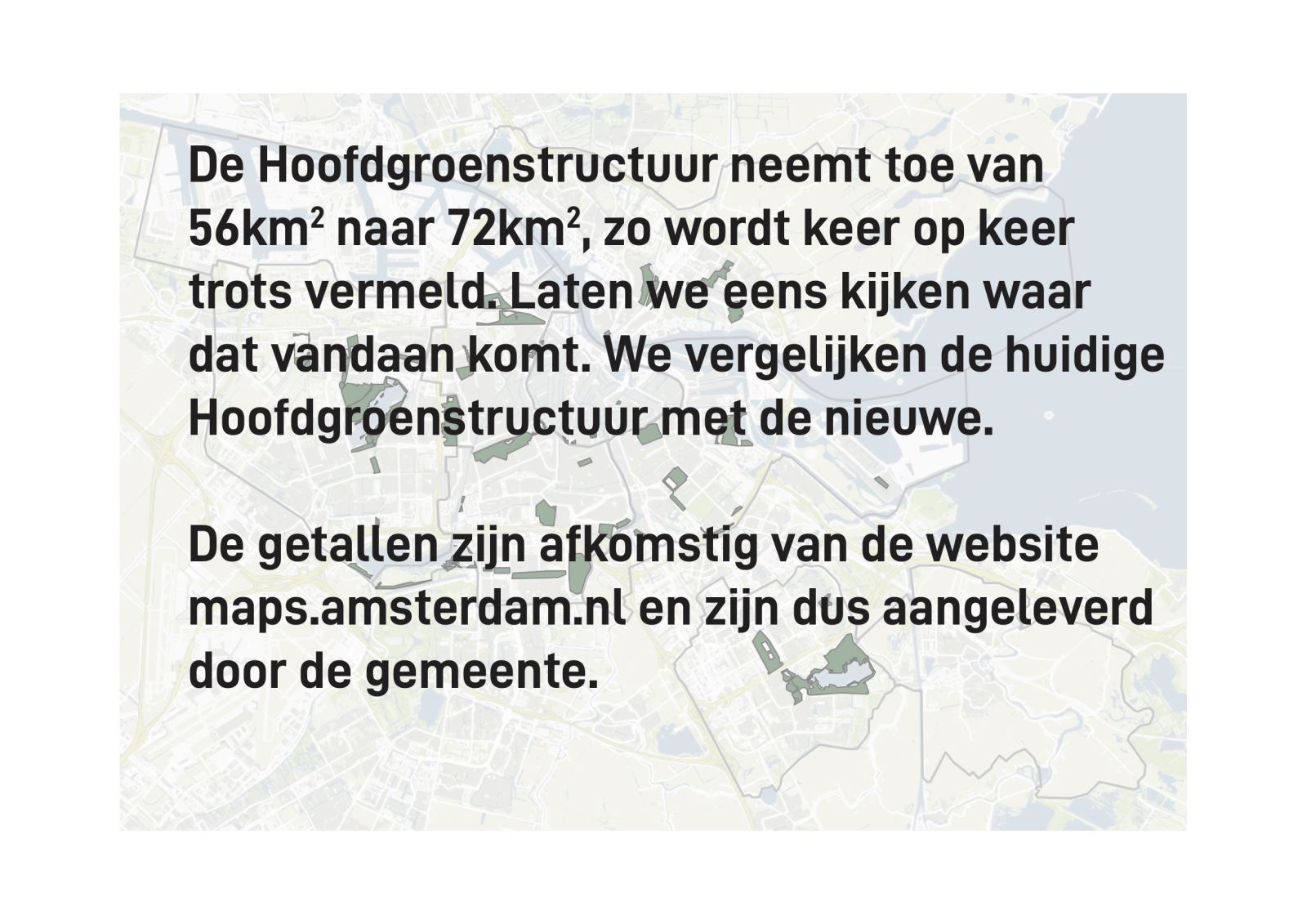 Het wordt gekker als we de claim van 72 km2 onderzoeken. Dat is een abstract getal en een toename van 56 naar 72 km2. Dat klinkt als een klok, maar als we het grafisch relateren aan het totale grondoppervlak dan zien we dat dit alleen kan als er water en verkeersterrein wordt meegeteld. Dat blijkt ook uit de gedetailleerde vergelijking die later wordt gemaakt, waarin per groentype de huidige en de toekomstige HGS wordt vergeleken.